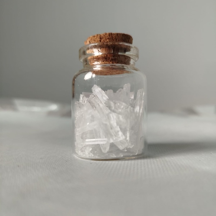 Ментол кристаллический — вещество натурального происхождения, изготавливается из масла мяты. Внешний вид: прозрачные кристаллы разного размера (от долей миллиметра до нескольких сантиметров). Температура плавления: от 43 градусов.